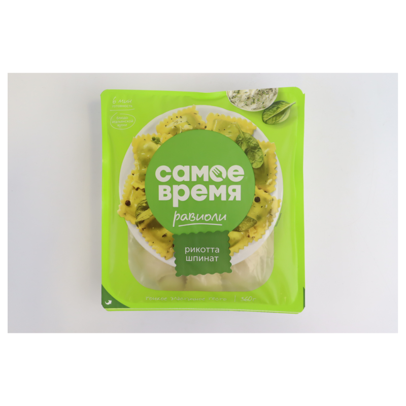 Равиоли с сыром рикотта и шпинатом - это идеальный выбор для любителей итальянской кухни. Упаковка весит 360 г амм, что позволяет насладиться этим вкусным блюдом в любое время. Состав включает свежий шпинат, нежный сыр рикотта и тонкое тесто, создавая идеальное сочетание в каждом кусочке.
