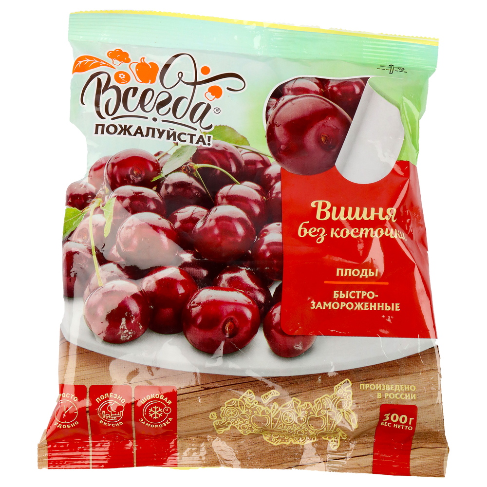 Вишня Всегда Пожалуйста без косточек представлена в упаковке весом 300 г амм. Этот продукт обычно является замороженным или консервированным и может использоваться для приготовления десертов, компотов, варенья, соусов или добавления в выпечку. Упаковка обеспечивает удобство хранения и использования продукта.