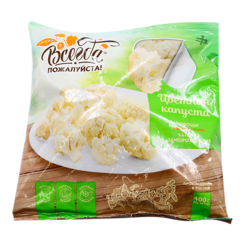 Капуста цветная «Всегда Пожалуйста» упакована в удобную порцию весом 400 г амм, предлагая свежие и качественные овощи для вашего стола. Этот сорт капусты отличается сочным вкусом, а также богатым содержанием витаминов и минералов, делая его идеальным выбором для здорового питания. Насладитесь удобством и качеством с капустой «Всегда Пожалуйста» , готовой украсить вашу кулинарную коллекцию.