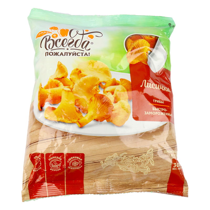 Грибы Лисички Всегда Пожалуйста в упаковке весом 300 г аммов - это свежие и ароматные грибы, готовые украсить ваш стол. Насладитесь неповторимым вкусом лисичек, добавляя их в супы, соусы, или приготовленные в сметанном соусе. Упаковка обеспечивает удобство хранения и сохраняет свежесть грибов, чтобы они всегда были готовы к использованию.