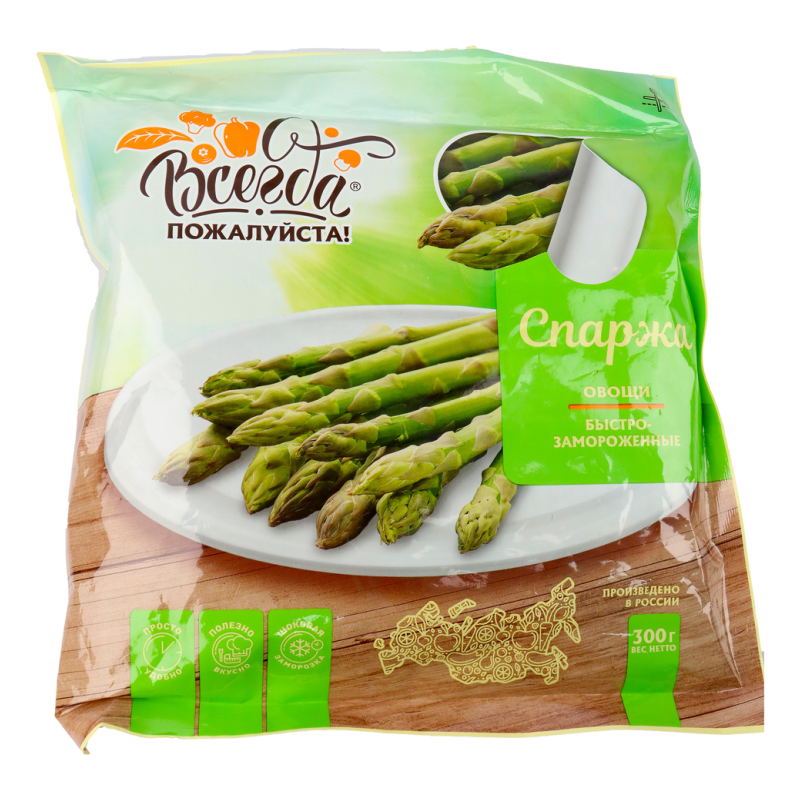 Спаржа всегда пожалуйста - это нежные зеленые стебли спаржи, выращенные с любовью и заботой, в упаковке весом 400 г амм. Этот продукт идеально подходит для готовки разнообразных блюд, добавляя им изысканный вкус и аромат свежей зелени.
