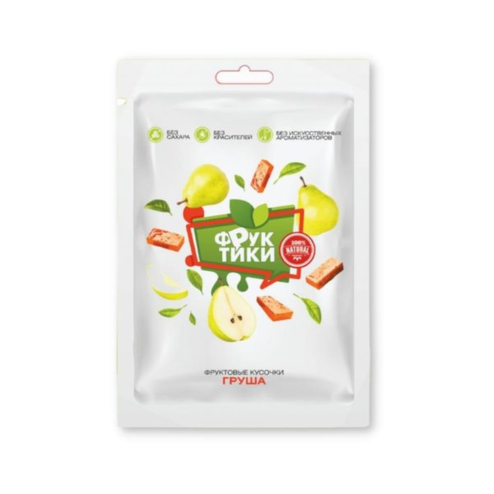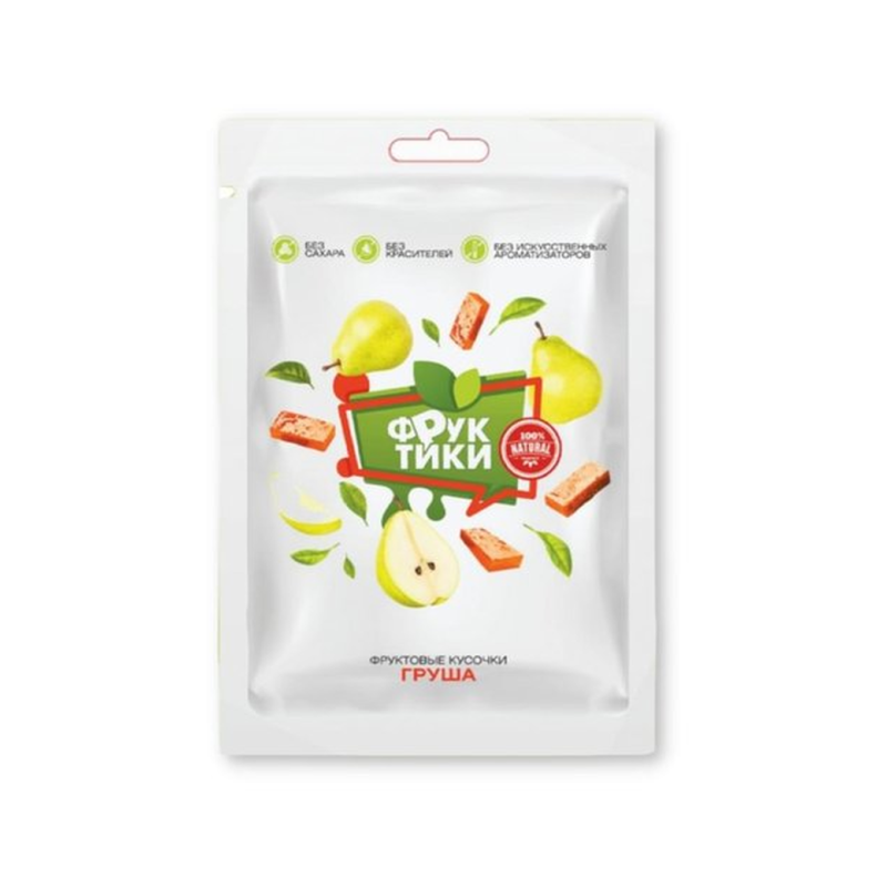 В основе продукта заложена груша и ее полезные свойства! Груши измельчаются до состояния пюре, добавляется для сладости натуральные сахорозаменители и упаковывается в специальную пленку, позволяющую продукту так долго храниться и не терять свои полезные свойства. Фруктики являются сладким решением проблем питания. Фруктовые кусочки содержат в себе множество витаминов и минералов, их употребление способствует улучшению и нормализации работы органов пищеварения.