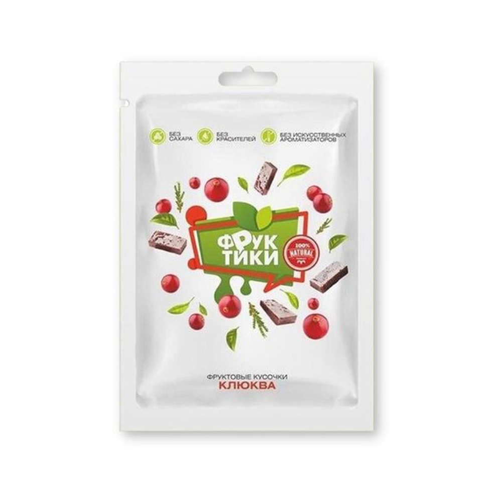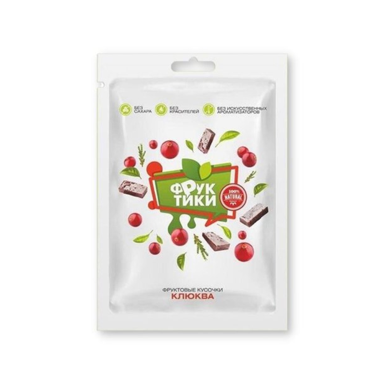 В основе продукта заложена дикорастущая клюква и ее полезные свойства! Клюква измельчается до состояния пюре, добавляется для сладости натуральные сахорозаменители и упаковывается в специальную пленку, позволяющую продукту так долго храниться и не терять свои полезные свойства. Фруктики являются сладким решением проблем питания. Фруктовые кусочки содержат в себе множество витаминов и минералов, их употребление способствует улучшению и нормализации работы органов пищеварения.