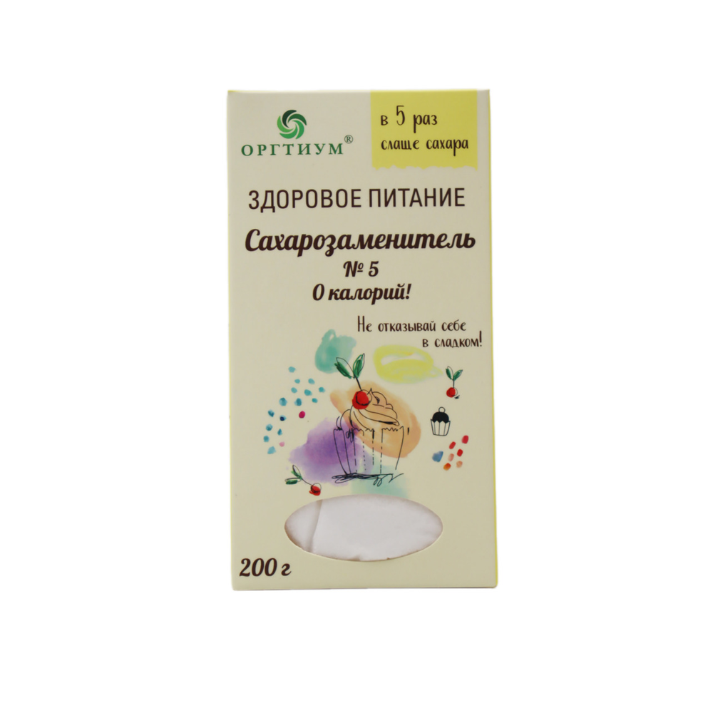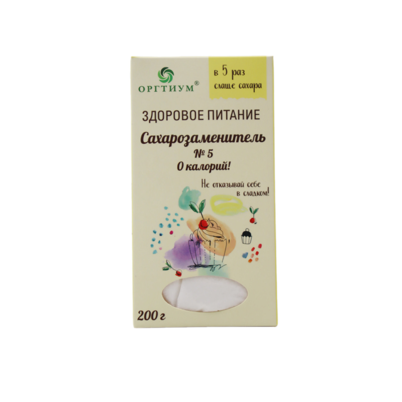 Сахарозаменитель «Оргтиум №5» - это продукт, который имеет пять раз более сладкий вкус по сравнению с обычным сахаром, при этом содержит всего 200 г амм сахара. Его состав включает специальные ингредиенты, которые придают продукту сладость, но не вызывают резких скачков уровня сахара в крови.