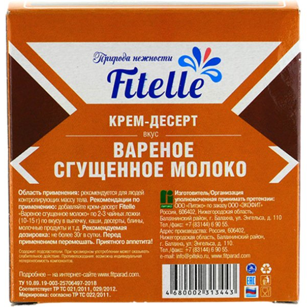 Fitelle карамельный крем-десерт - нежное сгущенное молоко с неповторимым вкусом карамели. Идеальное лакомство для сладкого перекуса или добавления в десерты. Попробуйте его как начинку для пирогов или добавьте в кофе для приятного сладкого вкуса. Размер упаковки 100 г Попробуйте сегодня и наслаждайтесь великолепным вкусом!