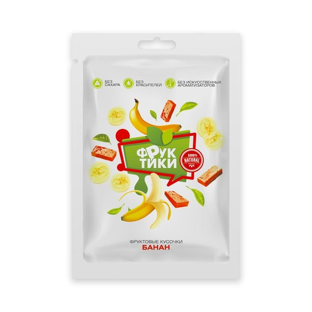 В основе продукта заложен банан и его полезные свойства! Банан измельчается до состояния пюре, добавляется для сладости натуральные сахорозаменители и упаковывается в специальную пленку, позволяющую продукту так долго храниться и не терять свои полезные свойства. Фруктики являются сладким решением проблем питания. Фруктовые кусочки содержат в себе множество витаминов и минералов, их употребление способствует улучшению и нормализации работы органов пищеварения.