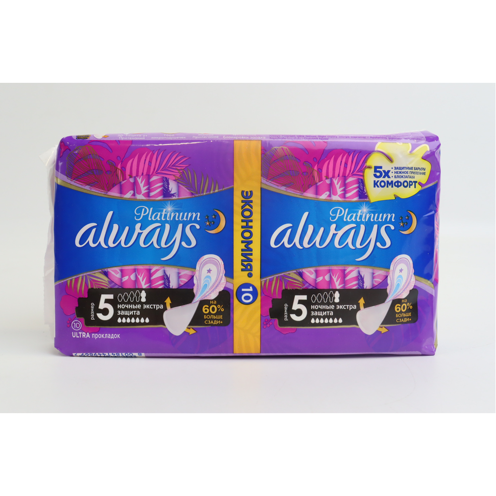 Прокладки Always Ultra Platinum Duo - ночные экстра защита 10 штук. Надежная защита на ночь для комфортного сна. Идеально подходят для использования во время месячных. Обеспечивают длительное ощущение сухости и свежести благодаря специальной технологии. Позволяют чувствовать себя уверенно в любой ситуации. Попробуйте и оцените удобство и надежность прокладок Always Ultra Platinum Duo уже сегодня!