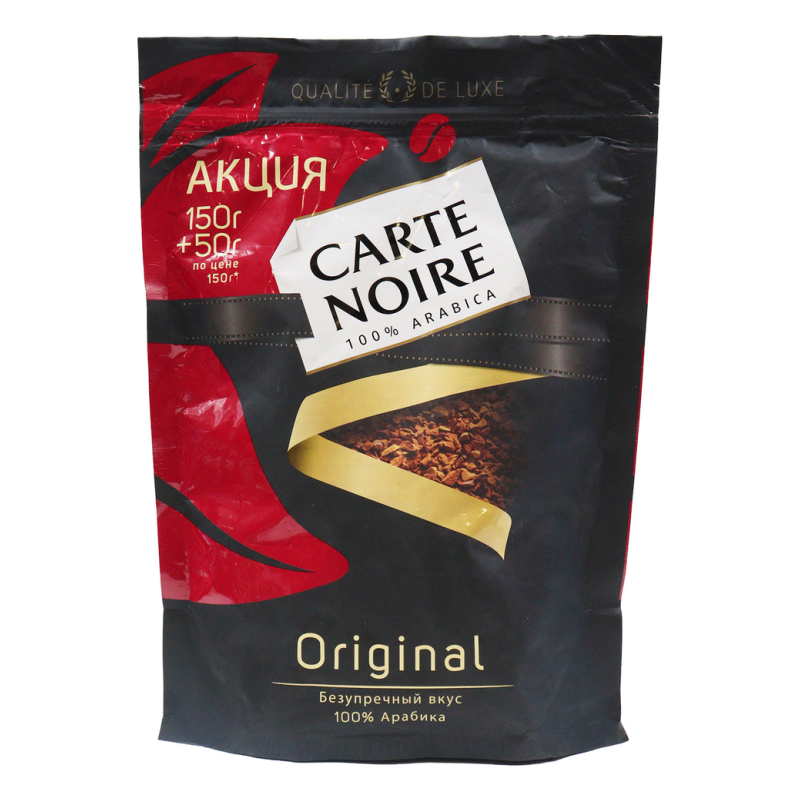 Кофе Carte Noire в пакете весом 150 г амм + 50 г амм. Этот кофе имеет насыщенный аромат и приятный вкус. Состав кофе Carte Noire включает в себя арабику и робусту из Африки и Латинской Америки.