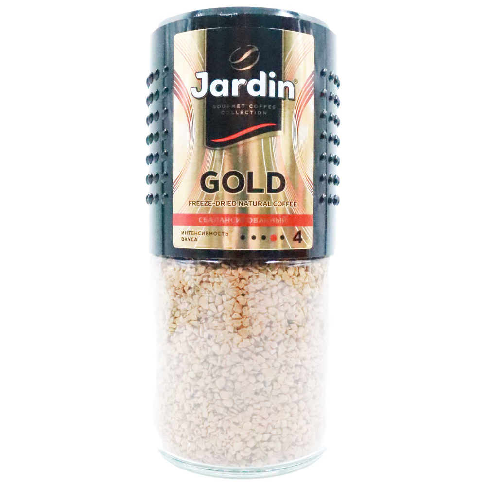 Кофе Jardin Gold растворимый стандартный бленд в зернах весом 95 г амм. Он состоит из арабики и робусты, прошедших процесс обжарки на среднем уровне. Этот кофе имеет приятный аромат и вкус с нотками молочной шоколадной горчинки.
