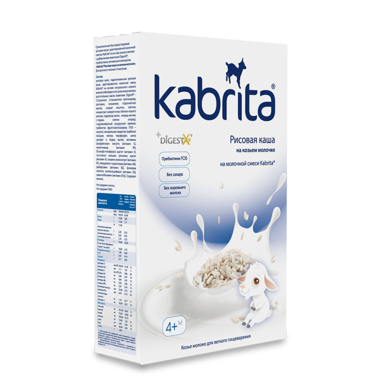 для детей с 4 месяцев, 180 г Нежная и воздушная рисовая каша на основе адаптированной смеси Kabrita идеальна для бережного перехода к злаковому прикорму и сбалансированного питания малыша первого года жизни. Приятный сливочный вкус каш Kabrita достигается исключительно за счет натурального молочного сахара – лактозы, без добавления подсластителей. Легко усваивается и хорошо перевар