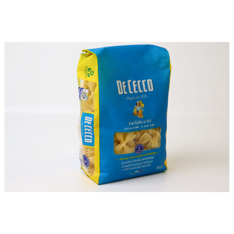 Макаронные изделия De Cecco Farfalle 93 500 г - это итальянские макароны в виде бабочек, изготовленные из высококачественной пшеницы и воды. Они имеют приятную текстуру и вкус, а также прекрасно подходят для приготовления различных блюд. Состав макаронных изделий De Cecco Farfalle 93 500 г : пшеница, вода.