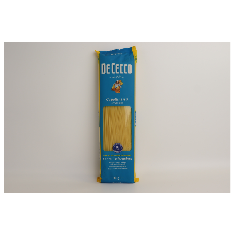 Макаронные изделия De Cecco Capellini 9 - это итальянские макароны из пшеничной муки первого качества. Они имеют тонкую форму и идеально подходят для приготовления любых блюд. Состав макаронных изделий De Cecco Capellini 9 включает в себя только пшеничную муку и воду.