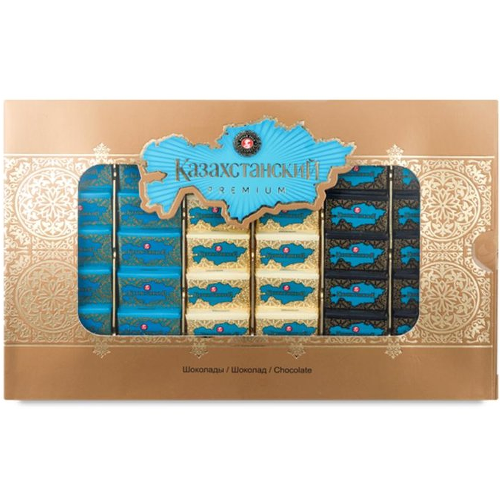Набор шоколада Казахстанский представляет собой прекрасное сочетание вкуса и аромата. Он состоит из пяти видов шоколада с разными начинками: молочный с карамелью, молочный с орехами, молочный с кофе, темный с какао и темный с изюмом. Общий вес набора составляет 185 г амм.