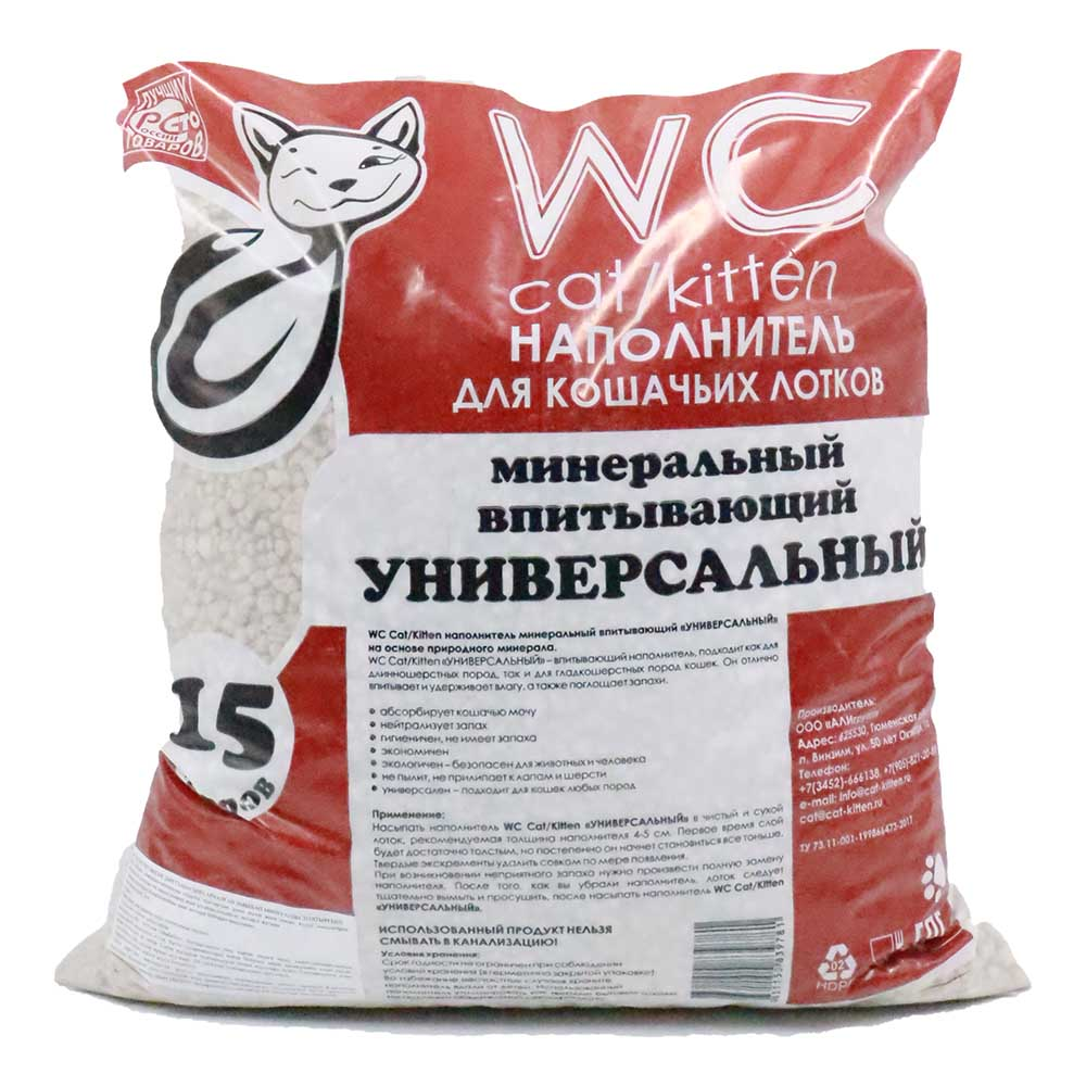 Минеральный наполнитель для кошачьих туалетов WC Cat/Kitten «Универсальный» , объемом 15 л итров, идеально подходит для кошек всех пород и возрастов. Этот наполнитель обеспечивает эффективное поглощение запахов и образование крепких комков для легкой очистки лотка. С его помощью вы можете обеспечить вашему питомцу чистоту и комфорт в туалете.