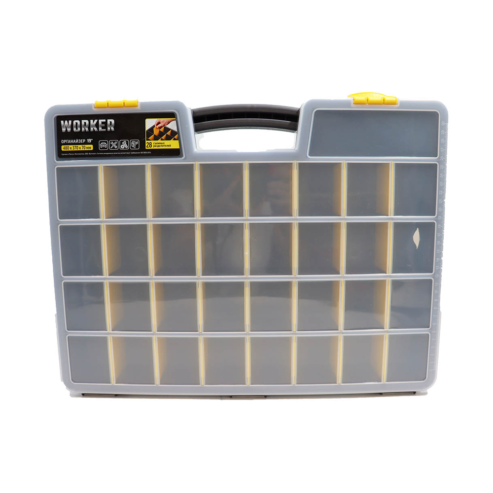 Органайзер для строительных материалов линейки Worker поможет рассортировать крепежные и другие материалы: саморезы, гвозди, дюбели, болты, винты и пр. Внутри органайзера - съёмные подвижные разделители, с помощью которых при необходимости можно сформировать ячейки нужного размера. Прочные замки не позволят органайзеру раскрыться и просыпать содержимое. Благодаря цельной округлой ручке органайзер удобно переносить или снимать с полки. Прозрачная крышка позволяет видеть, что именно хранится внутри. Изготавливается из 100% перерабатываемого прочного безопасного полипропилена, не боится влажности и перепадов температур, легко моется.